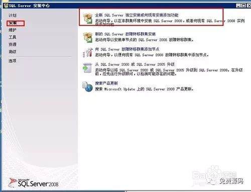 在“SQL Server”中心中选择左侧面的“安装”双击“全新SQL Server 独立安装或向现有安装添加功能”