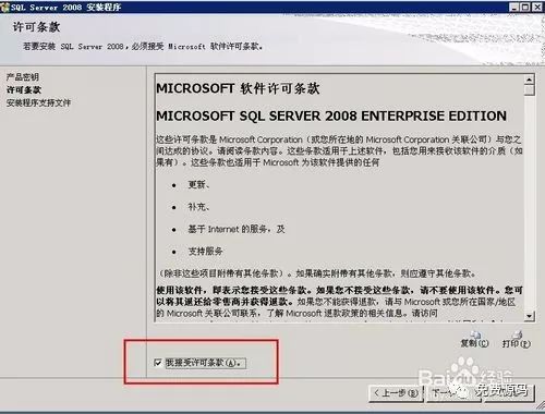 在“许可条款”界面中选择“我接受许可条款”打勾,然后点击“下一步”。
