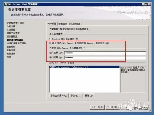 在“数据库引擎配置”界面中选择“混合模式”输入密码,然后点击“下一步”按钮。