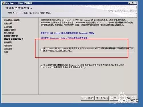 在“错误和使用情况报告”界面中在第一个前面打勾。然后点击“下一步”按钮。