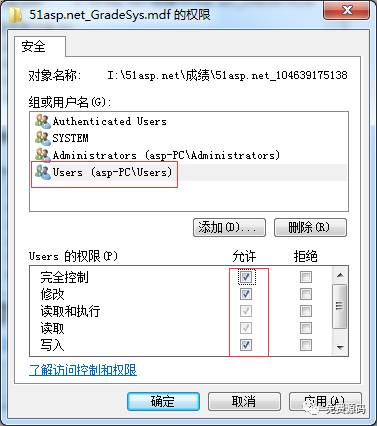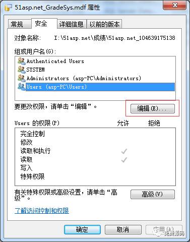 打开编辑窗口,编辑"Users"用户的权限,把"完全控制" "修改" "写入" 前面的勾勾上,点击确定保存,再次回到数据库就可以附加成功了