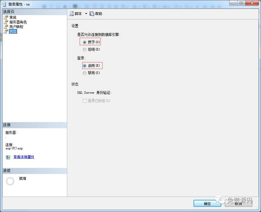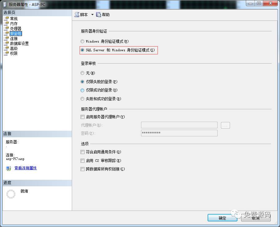 打开属性窗口,切换到"安全性"选项卡,选择“sql server和windows身份验证模式”,点击“确定”保存退出