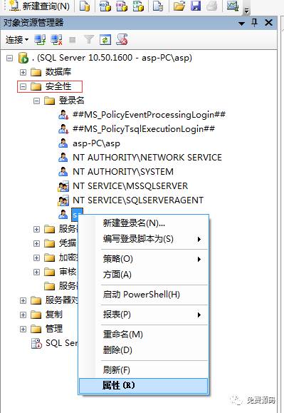 打开安全性选项卡,然后在sa用户上右键单击,选择属性