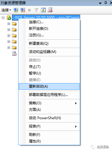 最后重启一下数据库服务,在服务器上右键单击,选择"重新启动",然后就可以用sa账号和设置好的密码登录了。
