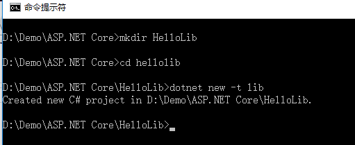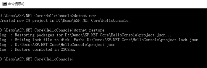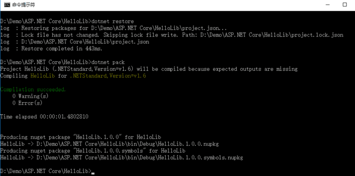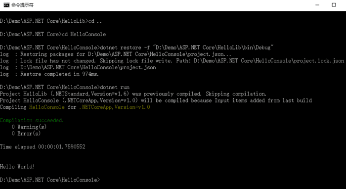 还原的命令为 dotnet restore -f "D:\Demo\ASP.NET Core\HelloLib\bin\Debug"