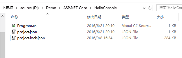 直接执行“dotnet new”创建的控制台应用只包含如下两个文件,其中包含程序入口方法的所有C#程序定义在Program.cs 中,另一个则是项目描述文件project.json。