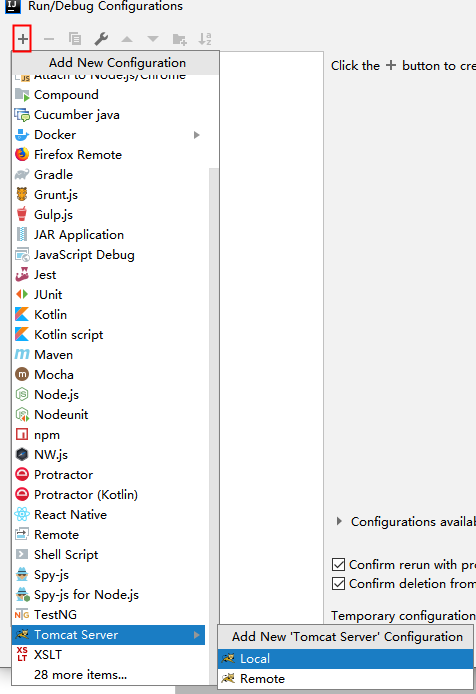 点击右上角Add Configuration,打开Tomcat配置。(没有Tomcat需要安装)