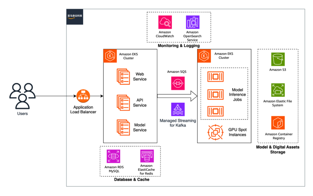 Akool 使用的亚马逊云科技产品包括 Amazon EC2、Amazon RDS、Amazon DynamoDB、Amazon Lambda、Amazon Cloudfront 等,以构建网关、监控和数据存储等基础服务。其中 Amazon Lambda 配合 Amazon S3 使用提供了灵活的数据处理能力;在 AI 业务领域,Akool 利用 Amazon EC2 G5 实例来处理庞大的计算负荷,并采用 Amazon SageMaker 来构建 、训练、优化机器学习算法。基于 NVIDIA GPU 的 G5 实例非常适合于处理机器学习推理和图形密集型计算,加快了内容生成过程,同时最大限度地减少了运营支出,让 Akool 能够在不牺牲性能的情况下大幅提升效率,减少了20%用户排队情况,满足用户多样化的 AI 内容创作需求。