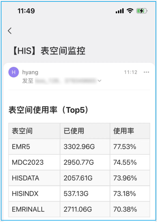 import smtplibfrom email.mime.text import MIMETextfrom email.mime.multipart import MIMEMultipartfrom pprint import pprintimport cx_Oracleimport sys# 发件人邮箱账号email = 'hyang0@example.com'password = 'password'# 收件人邮箱地址to_email = 't1@example.com'# 设置收件人邮箱列表receivers = ["r1@example.com", "r2@example.com"]# 设置抄送人邮箱列表#cc = ["cc1@example.com", "cc2@example.com"]# 创建消息对象msg = MIMEMultipart()msg['From'] = emailmsg['To'] = ', '.join(receivers)# msg['Cc'] = ', '.join(cc)msg['Subject'] = '【HIS】表空间监控'def init_oracle(oci_path):'''初始化 Oracle 驱动'''try:if sys.platform.startswith("darwin"):# lib_dir = os.path.join(os.environ.get("HOME"), "Downloads",# "instantclient_19_8")lib_dir = oci_pathcx_Oracle.init_oracle_client(lib_dir=lib_dir)elif sys.platform.startswith("win32"):lib_dir=oci_pathcx_Oracle.init_oracle_client(lib_dir=lib_dir)except Exception as err:print("Whoops!")print(err)sys.exit(1)def table_space():''''返回SQL查询结果'''connection = cx_Oracle.connect(user="test", password="password",dsn="192.168.1.1/orcl")cursor = connection.cursor()cursor.execute("""select t.* from (select UPPER(F.TABLESPACE_NAME) as "表空间名称",ROUND(D.AVAILB_BYTES, 2) as "表空间大小(G)",ROUND(D.MAX_BYTES, 2) as "最终表空间大小(G)",ROUND((D.AVAILB_BYTES - F.USED_BYTES), 2) as "已使用空间(G)",TO_CHAR(ROUND((D.AVAILB_BYTES - F.USED_BYTES) D.AVAILB_BYTES * 100,2),'999.99') as "使用比",TO_CHAR(ROUND((D.AVAILB_BYTES - F.USED_BYTES) D.MAX_BYTES * 100, 2),'999.99') as "最终使用比",ROUND(F.USED_BYTES, 6) as "空闲空间(G)",ROUND(D.MAX_BYTES - D.AVAILB_BYTES, 2) as "最终空闲可用空间(G)"from (select TABLESPACE_NAME,ROUND(sum(BYTES) (1024 * 1024 * 1024), 6) USED_BYTES,ROUND(max(BYTES) (1024 * 1024 * 1024), 6) MAX_BYTESfrom SYS.DBA_FREE_SPACEgroup by TABLESPACE_NAME) F,(select DD.TABLESPACE_NAME,ROUND(sum(DD.BYTES) (1024 * 1024 * 1024), 6) AVAILB_BYTES,ROUND(sum(DECODE(DD.MAXBYTES, 0, DD.BYTES, DD.MAXBYTES))(1024 * 1024 * 1024),6) MAX_BYTESfrom SYS.DBA_DATA_FILES DDgroup by DD.TABLESPACE_NAME) Dwhere D.TABLESPACE_NAME = F.TABLESPACE_NAMEorder by 6 desc) t where rownum <= 5""",)r = []for i in cursor:r.append(i)connection.close()if len(r) == 0:sys.exit()return rcss = '''<style>table {border-collapse: collapse;width: 100%;margin: 20px 0;}th,td {padding: 8px;text-align: left;border: 1px solid #ddd;}th {background-color: #f2f2f2;color: #444;}tr:nth-child(odd) {background-color: #f9f9f9;}</style>'''html_text = '<h3>表空间使用率(Top5)</h3>'html_text += '<p></p>'html_text += '''<table><thead><tr><th>表空间</th><th>已使用</th><th>使用率</th></tr></thead><tbody>'''init_oracle(oci_path=r"D:\app\instantclient-basic-windows.x64-11.2.0.4.0\instantclient_11_2")r = table_space()for record in r:ts = record[0]size_used = record[3]usage = record[5]html_text += '<tr>\n'html_text += '<td>' + ts + '</td>\n'html_text += '<td>' + str(size_used) + 'G</td>\n'html_text += '<td>' + usage.strip() + '%</td>\n'html_text += '</tr>\n'html_text += '''</tbody></table>'''#print(html_text)#sys.exit()# 邮件正文#body = '这是一封通过Python SMTP库发送的测试邮件。'#msg.attach(MIMEText(body, 'plain'))# HTML邮件正文msg.attach(MIMEText(css+html_text, 'html'))# 连接到SMTP服务器with smtplib.SMTP('192.168.1.1', 25) as smtp:# smtp.starttls() # 启用TLS加密smtp.login(email, password) # 登录到你的邮箱账号smtp.send_message(msg) # 发送邮件