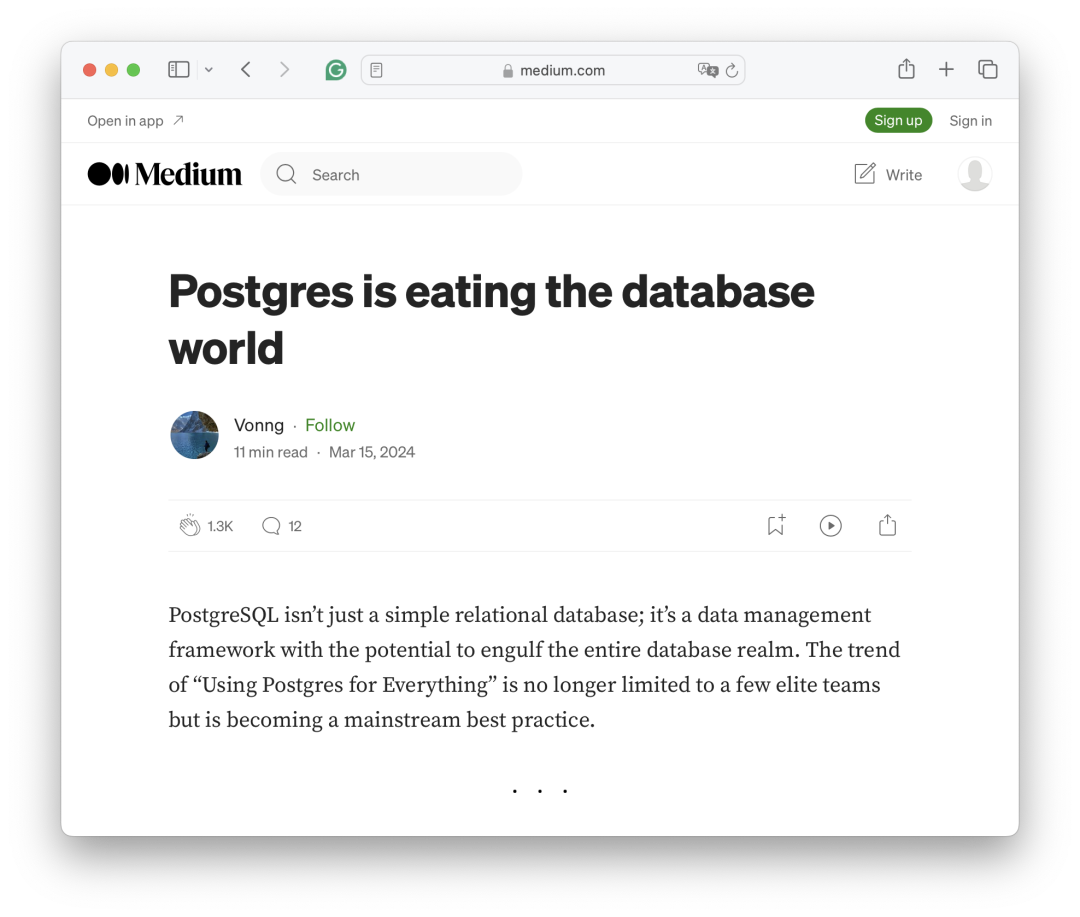 能被 PostgreSQL 全球社区核心组成员提名推荐,我感到非常荣幸。上文中 Jonathan 提到我的文章是《PostgreSQL正在吞噬数据库世界》,英文版为《PostgreSQL is Eating The Database World[16]》。发布于 Medium:https://medium.com/@fengruohang/postgres-is-eating-the-database-world-157c204dcfc4 ,并在 HackerNews ,X,LinkedIn 上引起相当热烈的讨论。