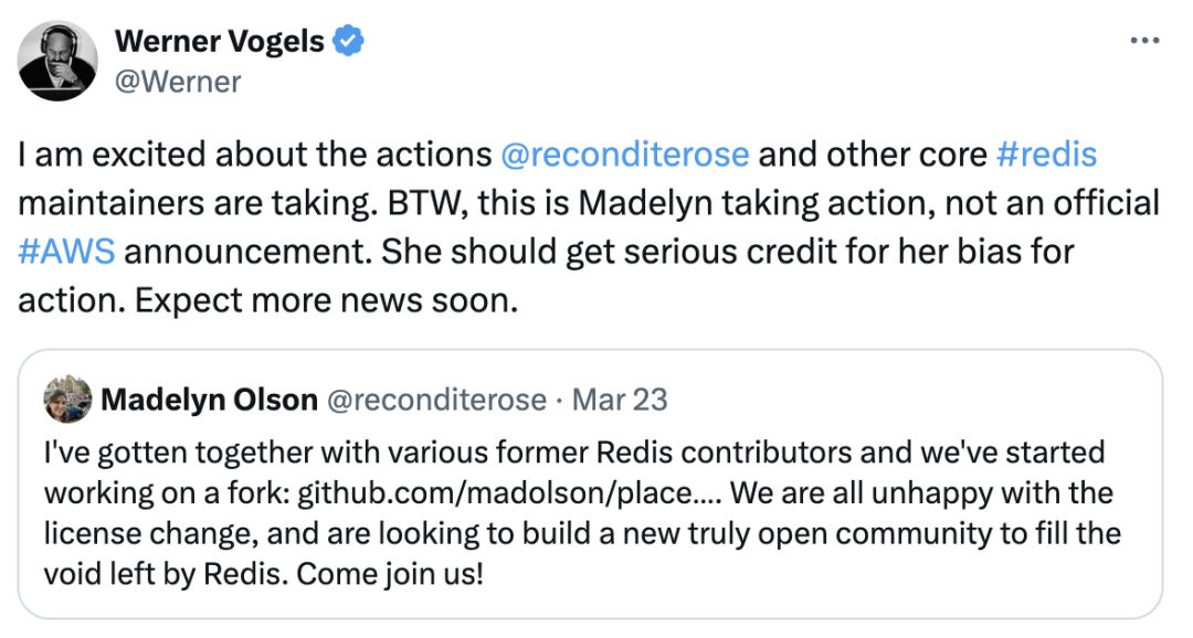 当 Redis 宣布更改协议后,马上就有 AWS 员工跳出来 Fork Redis —— “Redis 不开源了,我们的分叉才是真开源!” 然后 AWS CTO 出来叫好并惺惺作态:这是我们员工的个人行为 —— 堪称现实版杀人诛心。而同样的事情已经发生过好几次了,比如分叉 ElasticSearh 的 OpenSearch,分叉 MongoDB 的 DocumentDB。