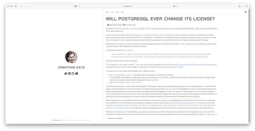 •许可证的名字就叫 “PostgreSQL许可证[10]” —— 你都用项目来命名许可证了,还改什么协议?•PostgreSQL项目发起时,以开源社区协作为主旨,意在防止任何单一实体控制本项目。这一点作为项目的精神主旨已经延续了近三十年时间了,并且在项目 项目政策 [11]中有着明确体现。•Dave Page 在这封邮件中明确表示过[12] 😊
