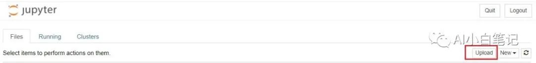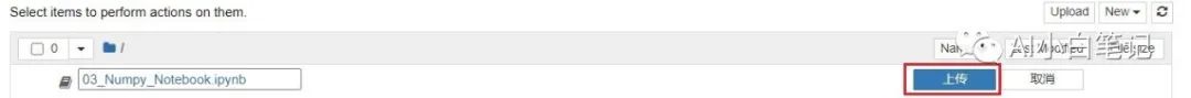 在首页上方点击upload,选择后缀名是ipynb文件后,upload下方会显示文件名,这时点击上传按钮,即可上传成功。