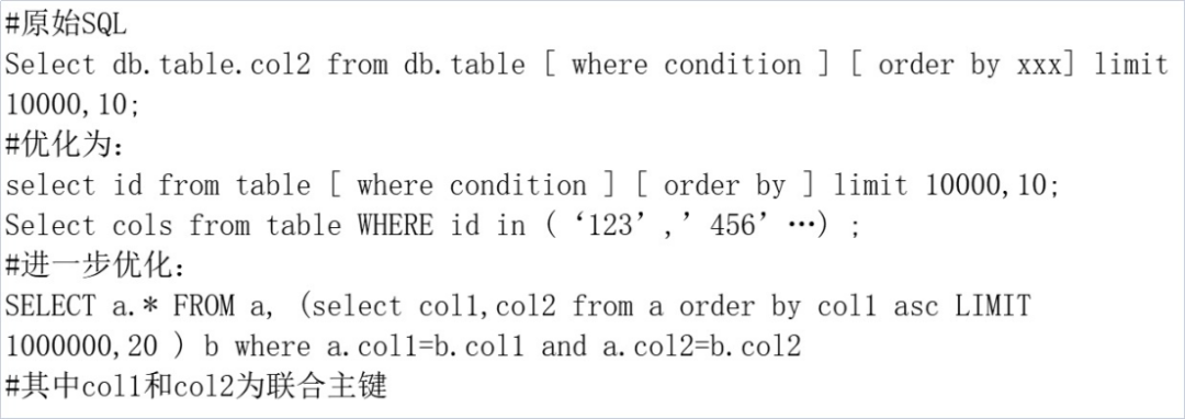 Limit方式下的分页,建议排序字段和where条件字段、select_list字段列表一起建立联合索引,避免大数据量遍历时会有全表扫描或者直接读聚簇索引页,避免计算节点二次排序有大量的IO、内存、网络开销。推荐的优化方式: