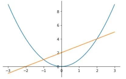 import matplotlib.pyplot as pltimport numpy as npax=plt.gca()ax.spines['right'].set_color('none') #隐藏右边的边界线ax.spines['top'].set_color('none') #隐藏顶部的边界线ax.spines['bottom'].set_position(('data',0))ax.spines['left'].set_position(('data',0))x=np.linspace(-3,3,200)y1=x**2y2=x+2plt.plot(x,y1)plt.plot(x,y2)plt.show()