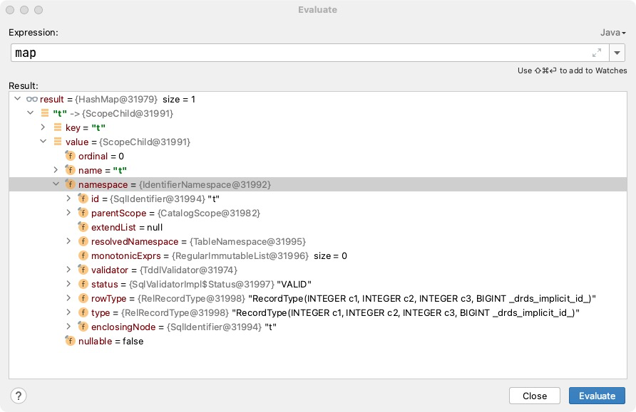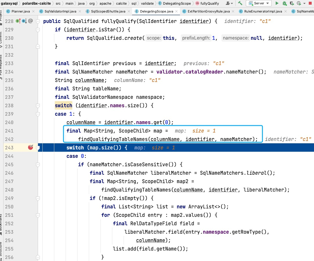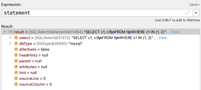 需要注意的是,在这个地方,我们是只进行语法解析,而不进行语义解析。什么意思呢,比如你现在输入的SQL为select c1 from tt,此时虽然我们没有tt这张表,但是断点处还是会正常解析出一个SQLSelectStatement,有兴趣的同学可以打个断点试一下。