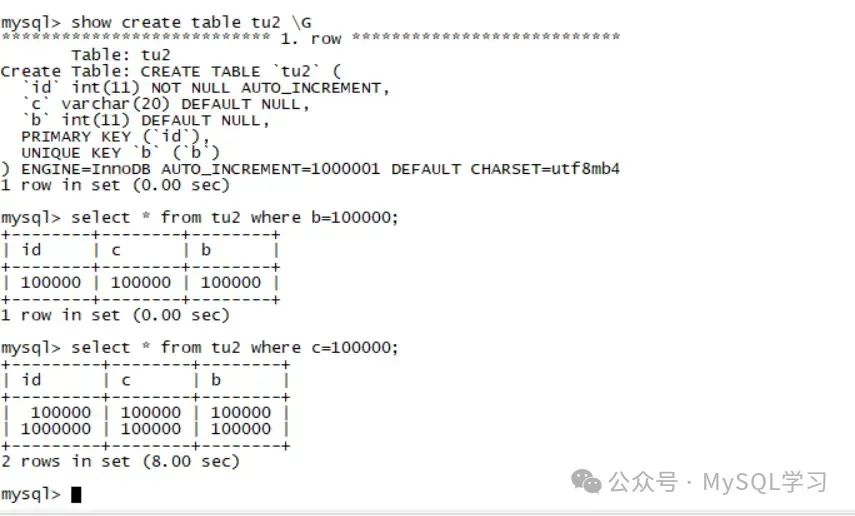 这里b列是一个唯一索引,我们看到了第二查询出现了2个相同的值