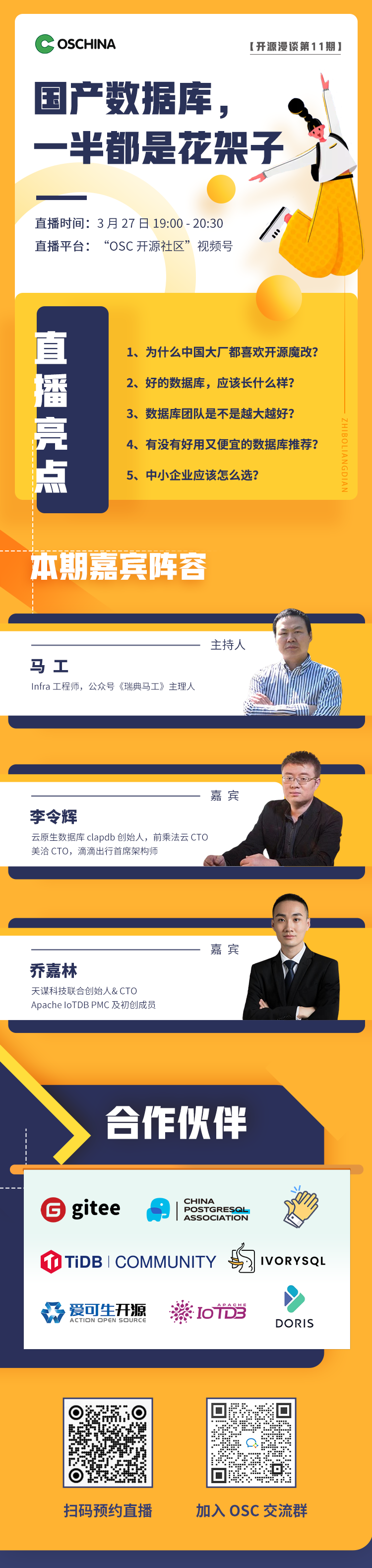 你用过哪些国产数据库?你觉得数据库行业有雷吗?快扫码预约直播,一起听听大佬们的分享吧!还可以进我们的 OSC 技术交流群,一起聊聊你的选型心得~