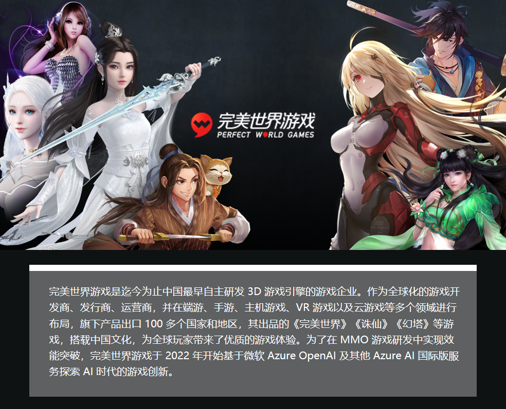 在 Azure OpenAI 的支持下,AI 技术在完美世界游戏在研发 MMO 项目组中达到了全流程应用,提升了 35% 的产品开发效率与 23% 的美术产出效率,目前完美世界游戏旗下的所有游戏工作室 100% 都已经展开了对 AI 技术的拥抱 。