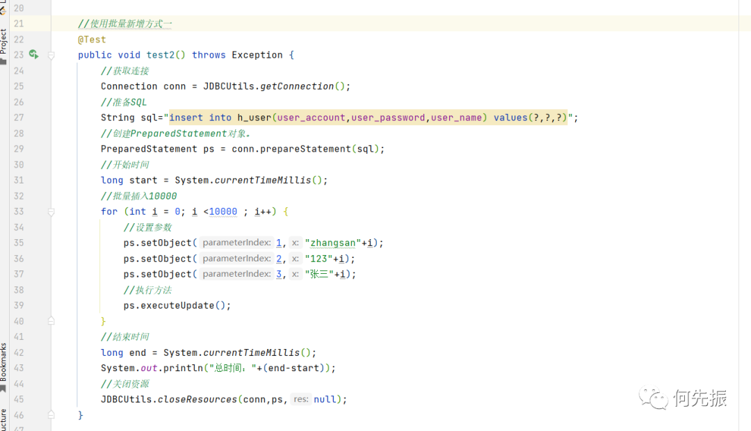 编写批量新增代码,通过循环调用excuteUpdate方法进行批量新增。并且记录下插入1万条记录的耗时时间。