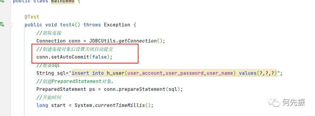 创建连接对象后,调用setAutoCommit()方法,传入false表示关闭自动提交。
