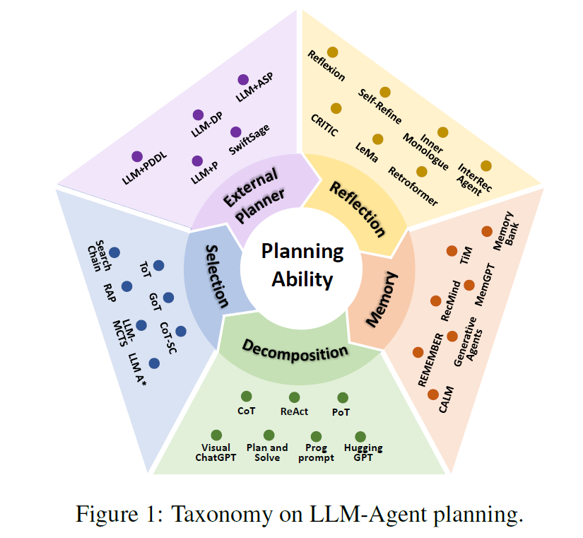 自从LLM显示出智能的萌芽以来,人们越来越关注使用LLM来增强代理的规划能力。主要方向在图1中总结,第3至7节详细介绍并分析了各种方法。我们还对四个基准进行了实验,比较了几种代表性方法的有效性,并表明性能随成本的增加而提高。尽管这些工作在规划能力方面取得了增强,但仍存在一些重大挑战。