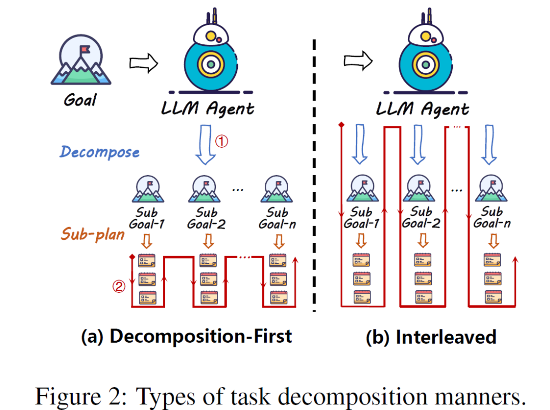 在现实世界的场景中,环境通常以复杂性和可变性为特征,因此通过一步规划过程解决复杂任务是一个巨大的挑战。这种简化复杂任务的能力是人类的一个显著能力,体现在将一个任务分解为几个更简单的子任务上,这类似于众所周知的“分而治之”算法策略。任务分解通常涉及两个关键步骤:首先,将复杂任务分解为子目标,称为“分解”步骤;其次,为子目标进行规划,称为“子计划步骤”。目前该领域中的任务分解方法通常分为两类:分解优先和交错分解,如图2所示。