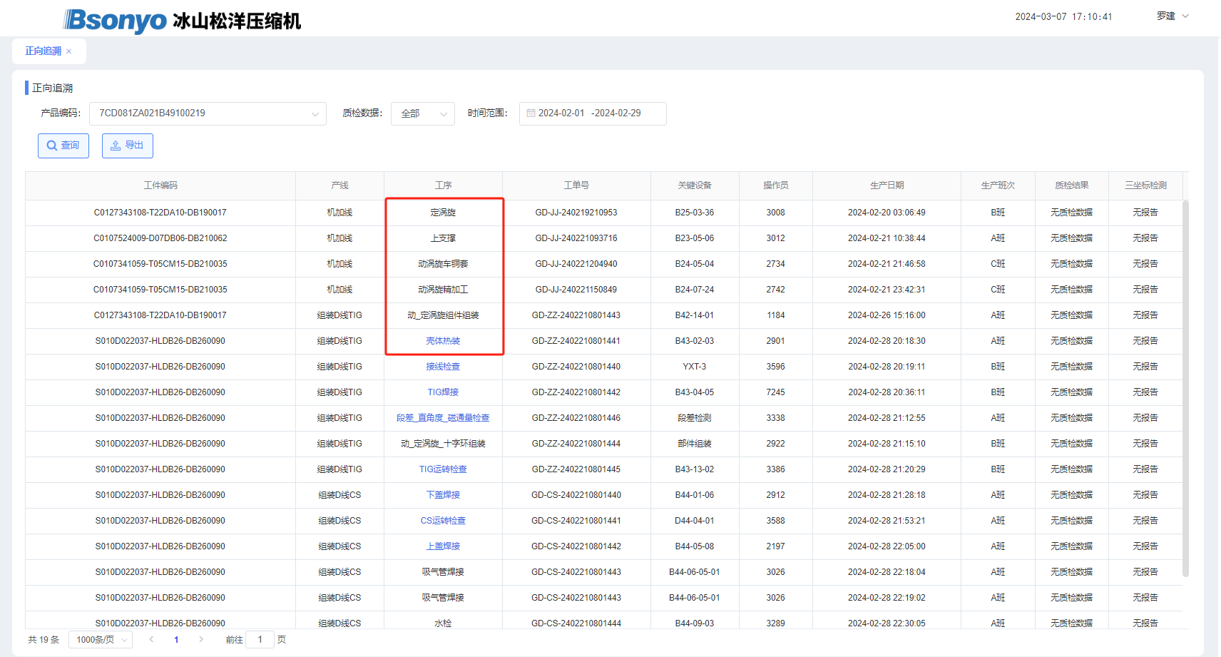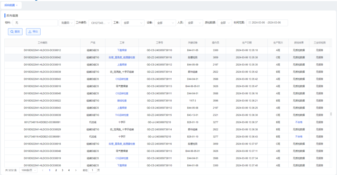 反向追溯功能:则能够从问题出发,通过物料批次、零件编号、人员信息、设备编号等条件,精准定位过程数据。这为企业快速响应和处理质量问题提供了有力工具,有助于降低质量风险,提升客户满意度。