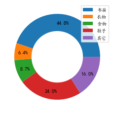 import matplotlib.pyplot as pltplt.rcParams['font.family']=['KaiTi']label=['书籍','衣物','食物','鞋子','其它']money=[560,80,109,300,200]inner=[1]_,ax = plt.subplots()ax.pie(money,radius=1,autopct='%.1f%%',pctdistance=0.8)ax.pie(inner,radius=0.6,colors='white')plt.legend(label)plt.show()