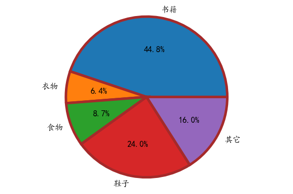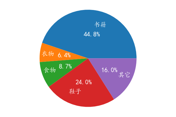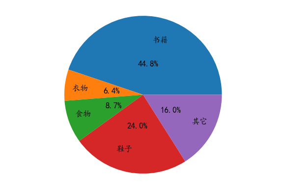 import matplotlib.pyplot as pltplt.rcParams['font.family']=['KaiTi']plt.figure(dpi=120)label=['书籍','衣物','食物','鞋子','其它']money=[560,80,109,300,200]plt.pie(money,labels=label,autopct='%.1f%%',labeldistance=0.7,pctdistance=0.4)plt.axis('equal')plt.show()