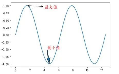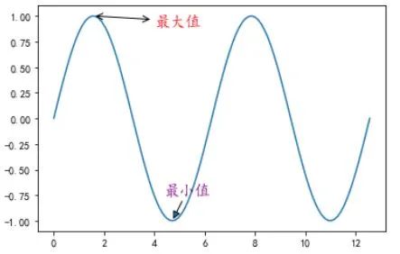 import numpy as npimport matplotlib.pyplot as pltplt.rcParams['font.family']=['KaiTi'] #设置中文字体plt.rcParams['axes.unicode_minus']=False #用来正常显示负号x=np.linspace(0,4*np.pi,100)y=np.sin(x)plt.plot(x,y)plt.annotate('最大值',xy=(np.pi/2,1),xytext=(4,0.9),arrowprops=dict(arrowstyle='<->'),color='r',fontsize=15)plt.annotate('最小值',xy=(3*np.pi/2,-1),xytext=(4.4,-0.75),arrowprops=dict(arrowstyle='-|>'),color='purple',fontsize=15)plt.show()