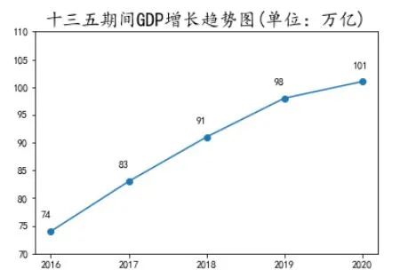 import numpy as npimport matplotlib.pyplot as pltplt.rcParams['font.family']=['KaiTi'] #设置中文字体data=[74,83,91,98,101]year=['2016','2017','2018','2019','2020']plt.plot(year,data,marker='o')plt.ylim(70,110)for xy in zip(year,data):plt.annotate('%s' % xy[1], xy=xy, xytext=(-10,13),xycoords='data', textcoords='offset points',fontsize=10)plt.title('十三五期间GDP增长趋势图(单位:万亿)',fontsize=18)plt.show()
