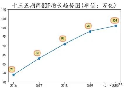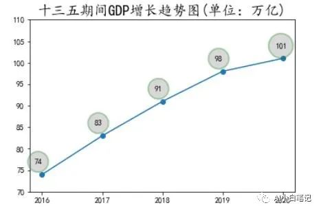 import numpy as npimport matplotlib.pyplot as pltplt.rcParams['font.family']=['KaiTi'] #设置中文字体data=[74,83,91,98,101]year=['2016','2017','2018','2019','2020']plt.plot(year,data,marker='o')plt.ylim(70,110)for xy in zip(year,data):plt.annotate('%s' % xy[1], xy=xy, xytext=(-10,13), textcoords='offset points',fontsize=10,bbox=dict(boxstyle='round4,pad=0.5', facecolor='y', edgecolor='red', linewidth=2, alpha=0.4))plt.title('十三五期间GDP增长趋势图(单位:万亿)',fontsize=18)plt.show()