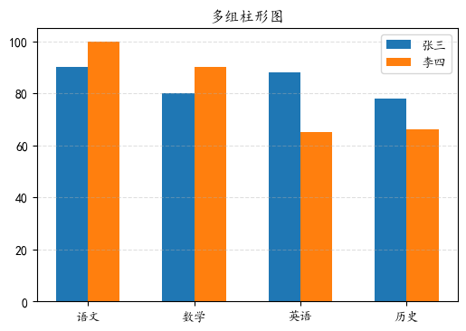 import matplotlib.pyplot as pltimport numpy as npplt.rcParams['font.family']='KaiTi'plt.figure(dpi=100)label=['语文','数学','英语','历史']zhang=[90,80,88,78] #张三的分数li=[100,90,65,66] #李四的分数x=np.arange(len(label)) #X轴的刻度width=0.3plt.bar(x-width/2,zhang,width=width,label='张三')plt.bar(x+width/2,li,width=width,label='李四')plt.title('多组柱形图')plt.legend()plt.grid(axis='y',alpha=0.4,ls='--')plt.xticks(x,label)plt.show()