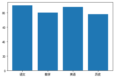 import matplotlib.pyplot as pltplt.rcParams['font.family']='SimHei'label=['语文','数学','英语','历史']score=[90,80,88,78]plt.bar(label,score)plt.show()