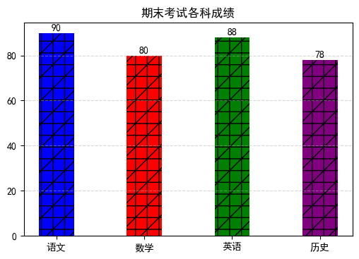 import matplotlib.pyplot as pltplt.rcParams['font.family']='SimHei'plt.figure(dpi=100)label=['语文','数学','英语','历史']score=[90,80,88,78]color=['b','r','g','purple']plt.bar(label,score,width=0.4,color=color,hatch='/+')plt.title('期末考试各科成绩')plt.grid(ls='--',alpha=0.5,axis='y')plt.show()