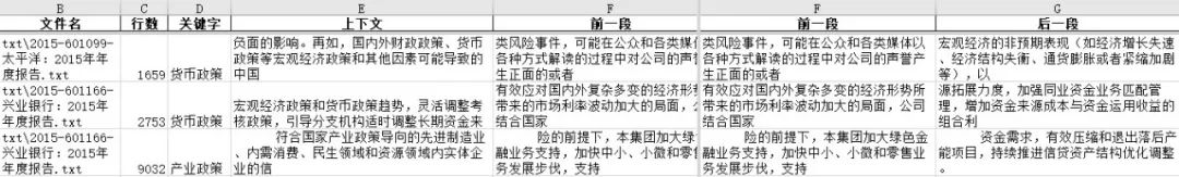 循环读取文件,根据指定的关键词,查找关键词所在的上下文。本例中,查找“产业政策|货币政策|环保政策”三个关键词。为便后续溯源和分析,查找结果存入Excel文件,包括六个字段:文件名、行数、关键字、上下文、前一段、后一段。