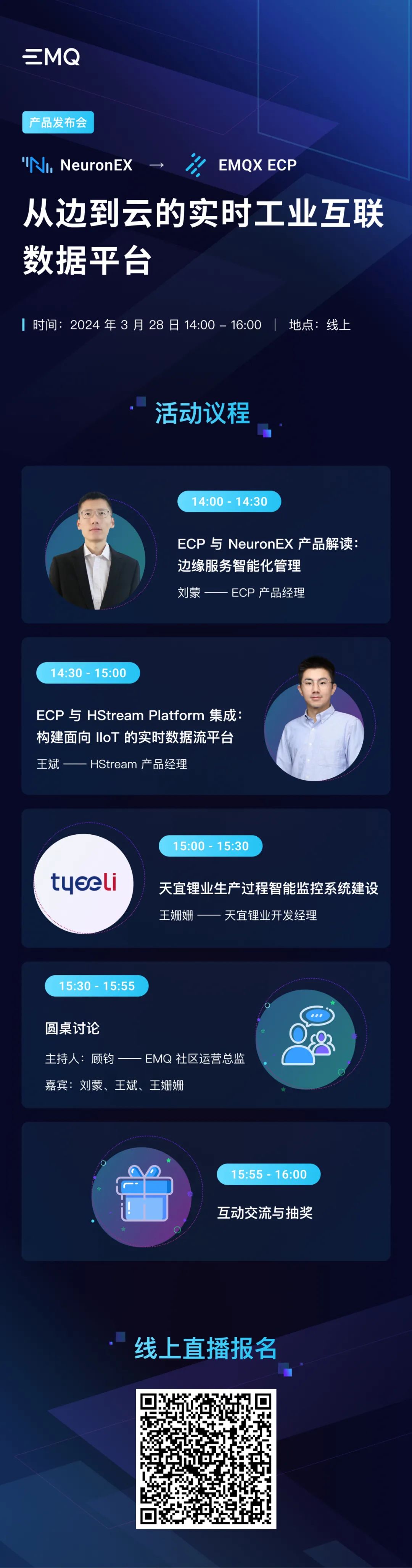 3 月 28 日,EMQ 将举办工业互联数据平台线上产品发布会。EMQ 有幸邀请到新能源锂电行业领军企业天宜锂业带来分享,展示其如何运用 EMQX ECP 工业互联数据平台构建新一代新能源生产管理数字化平台。同时,天宜锂业还将分享如何利用实时工业互联数据平台,实现生产过程的透明化管理以及优化升级,为参会者带来前沿的行业实践案例。