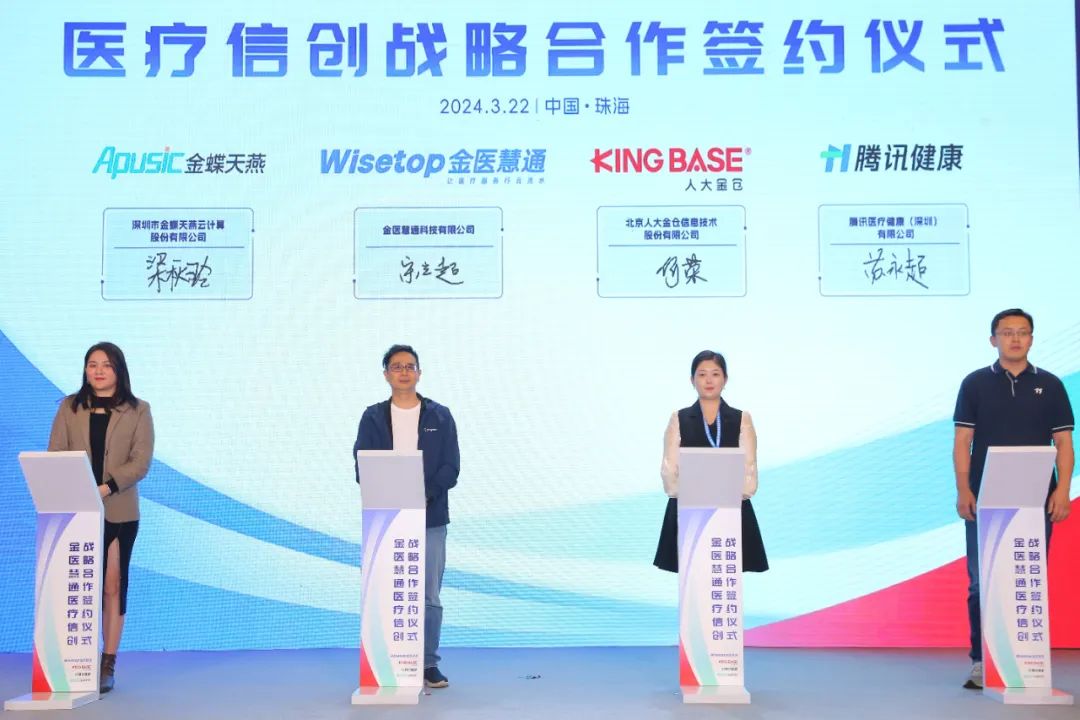 开幕式上,人大金仓医疗事业部总经理何荣代表公司与金医慧通、金蝶天燕、腾讯健康等合作伙伴进行了医疗信创战略合作签约。未来,人大金仓将与合作伙伴一起,充分整合优势资源,发挥各自在产品、市场等方面的优势,携手为用户创造更大的价值,提供更优质的服务,共同服务医疗行业高质量发展。