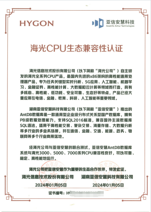 的兼容互认,并获得海光合作认证书。经湖南亚信安慧科技有限公司(简称“亚信安慧”)与海光信息技术股份有限公司(简称“海光公司”)双方团队严格测试,亚信安慧AntDB数据库系统与海光3000、5000、7000系列CPU兼客性良好,可以可靠、稳定、高性能地运行。