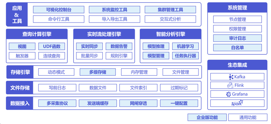 IoTDB 提供数据采集工具,可对接多类协议,底层为纯自研列式存储文件系统 TsFile,在此基础上设计存储、查询计算、流处理、分析引擎,以及系统管理模块与多种应用工具,并支持对接大数据生态,与单机版、分布式版、双活版等多类形态部署。