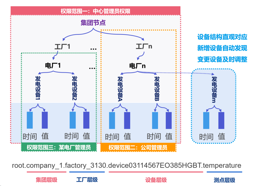 最后,在树形模型基础上,IoTDB 可以对序列级的权限进行更好的控制,比如可以为集团级、工厂级、产线级数据设置不同的权限范围,进而达到多层级数据高效管理的目的。