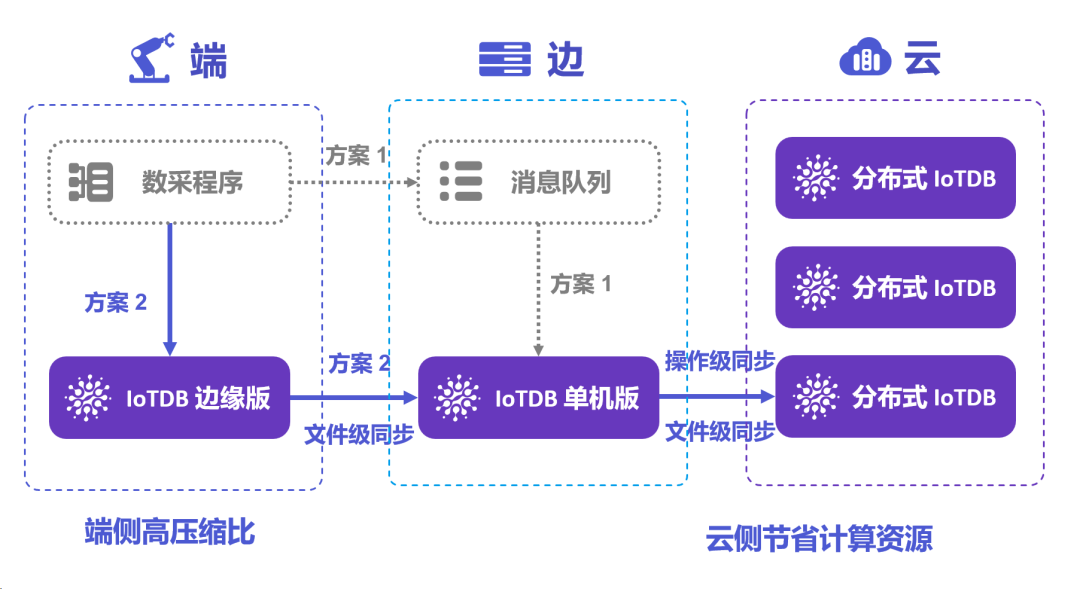 IoTDB 的数据同步便解决了这一问题。该方案基于可插拔的 TsFile 文件,并支持操作级、文件级的多种传输模式,与跨网闸传输、加密传输。同一个文件类型可在端、边、云侧进行协同传输,同步方案的易用性得以保障;传输模式多样则保障数据传输的实时性、吞吐量、安全性。