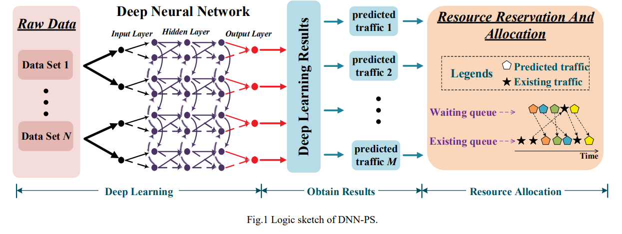在提出所提出的算法之前,我们提出了DNN-PS,如图1所示。我们利用与模式识别相关的深度学习架构来进行数据中心光网络的资源分配。DNN能够识别和表征大量原始数据中的复杂结构特征,而这些内部关系是普通机器学习方法不容易检测到的。为了建立更准确的预测模型,我们建立了一个包含数千万数据中心流量信息的数据库,并使用监督学习技术对其进行了数周的训练。流量数据每20秒从200多台服务器上收集一次,这些服务器部署在中国北京的国家重点实验室数据中心。我们在训练过程中调整DNN中的权重和偏差,以最小化目标函数。在获得令人满意的预测模型后,我们可以通过输入新的数据来获得预测结果。然后,预测结果将被导入DL-RA算法,以分配用于新到达业务的资源。DL-RA的核心是以高效的方式安排预测流量和退出流量,以最大限度地提高资源利用率,最大限度地减少对流量的不利影响。