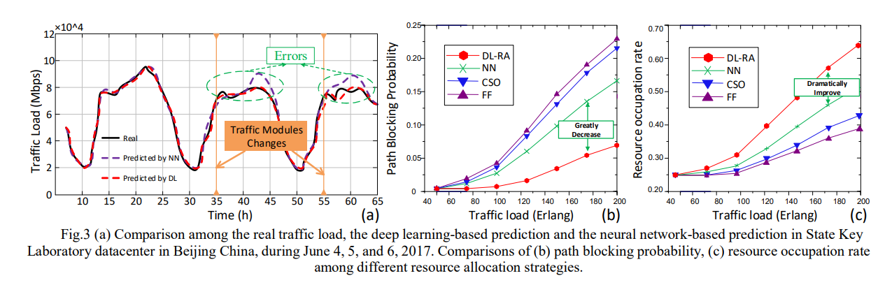 我们将DL-RA策略与几种最先进的资源分配技术进行了比较,包括流量异常检测中的NN-RA、CSO和FF。如图6所示,如图3(a)所示,深度学习的预测结果明显优于神经网络的传统预测结果。预测误差的产生是因为,流量直接受到许多非线性因素的影响,如热点事件、用户的移动模式等。因此,许多流量无法准确预测。基于计算,DL的预测精度比NN高出约7个百分点。在图3(b)中,我们比较了四种算法的资源占用率。在我们的预期范围内,DL-RA比NN-RA和其他两种具有更好的性能。DL-RA策略可以根据预测结果更合理地为业务分配资源。这是因为该算法同时考虑了流量的到达时间及其所需的资源。从图3(c)所示的结果来看,DL-RA和NN-RA都可以在很大程度上降低流量阻塞概率,并且当流量异常发生时,DL-RB的性能甚至优于NN-RA。原因是DL-RA可以提前为预测的高优先级流量预留足够的资源,从而降低了高优先级流量在重负载条件下的阻塞概率。