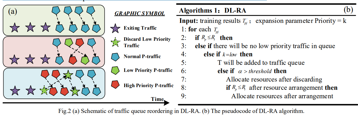对于每个预测流量Tpj,评估其优先级并计算所需资源。控制器获取数据中心中现有流量的当前资源使用状态和优先级。如果在Tpj到达时没有发现足够的连续资源被分配,则找出队列中是否存在任何低优先级业务。如果评估因子D大于阈值,则根据资源片段的当前分布和流量的优先级丢弃低优先级流量,如图所示。第2(a)段。完成上述工作后执行更新过程,根据流量处理的不同状态更新流量队列。因此,可以获得资源分配所需的主要信息,并如图2(b)所示详细描述了所提出的算法。