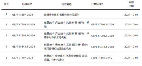 根据2024年3月15日国家市场监督管理总局、国家标准化管理委员会发布的中华人民共和国国家标准公告(2024年第1号),全国网络安全标准化技术委员会归口的5项网络安全国家标准正式发布。具体清单如下: