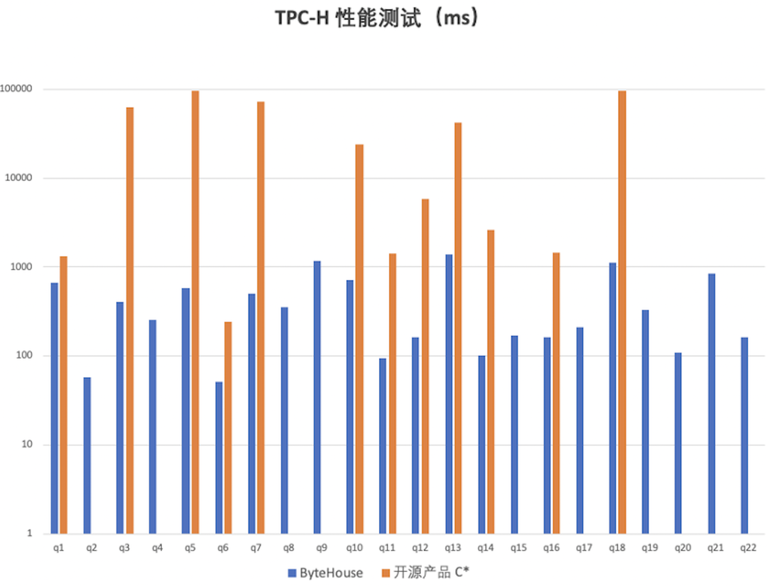 以TPC-H 数据集举例,在相同硬件和软件环境下, ByteHouse 查询效率高于本次基准测试产品几十倍。