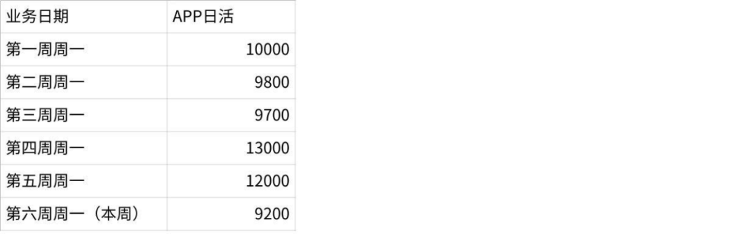 上述数据的前五周周一的均值:10900,标准差:1507,数据的2倍标准差分别为7887、13913,本周周一数据为7700,在2倍标准差范围外,则说明本周一日活指标数据波动异常,需要进一步分析异常波动原因,以判断业务是否真正存在异常。