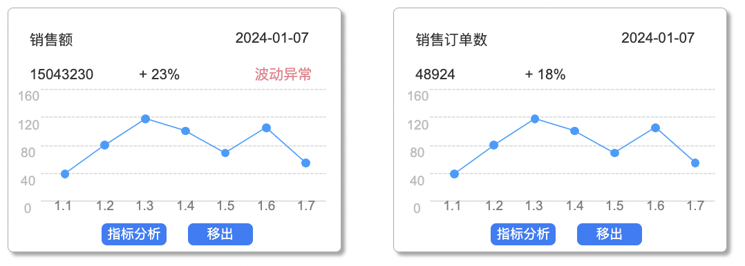 对于企业关注的指标,可以将指标添加到关注看板中进行日常数据观察与监控。在看板中可直观查看所有指标的当前数据表现、近期数据走势。系统会根据当前数据做智能诊断,判断指标波动是否为正常波动,帮助用户快速定位异常数据,针对性分析与应对数据变化。